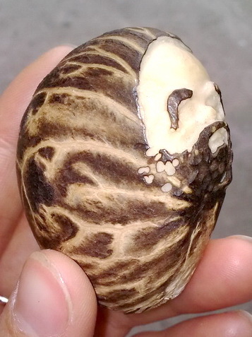 果實扣,果實扣是指的任何以天然果實、果殼等原料制作的紐扣,目前用在高檔西服上的主要是象牙果實扣。象牙果(Corozo nut,也叫vegetable ivory, palm ivory, corozo , tagua)是主要生長在巴拿馬南部、厄瓜多爾、玻利維亞的一種棕櫚樹的果實,該樹果實完全成熟后在熱帶陽光下晾曬3~4個月左右后會變成類似于象牙的乳白色堅硬物質。完全干燥后象牙果硬度與象牙同為1.5,顏色相近,因此可用于替代象牙產(chǎn)品,國內很多玩家現(xiàn)在用象牙果做原料,雕刻成各種工藝品,當然也有冒充象牙雕品蒙人的。下圖就是去掉部分表皮的象牙果: