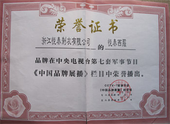 悅泰西服品牌在中央電視臺七套榮譽播出